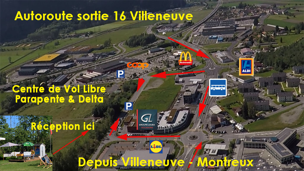 Autoroute sortie Villeneuve (16), aller jusqu'au rond-point à côté du Mc Donald, prendre à droite, ensuite première à gauche (Panneau brun indiquant Centre de Vol Libre) faire une centaine de mètres. Parking zone blanche avec disque durée 4 heures samedi, dimanche et jour férié compris. Ensuite à pied quelques mètres sur le chemin de terre entre la rangée d'arbres, et sur votre gauche notre réception.